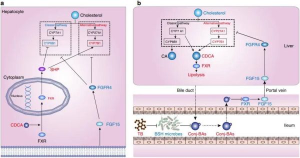 本研究发现,茶褐素是普洱茶中活性含量最高的成分之一,其改变了人体肠道菌群结构,与胆盐水解酶(BSH)活性有关的细菌丰度显著降低,通过进一步结合元基因组学研究显示,BSH活性功能亦明显下降,回肠结合型胆汁酸水平升高,从而抑制肠内FXR-FGF15信号传导途径,导致胆汁酸肝脏生成和粪便排泄增加,肝脏胆固醇含量降低,脂肪生成减少。