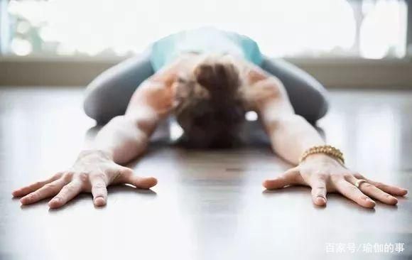 跪立,双脚并拢,双膝分开臀部坐在脚后跟上,大腿根向下压吸气延展侧腰,呼气前屈向下双手向前伸直,侧腰拉长额头点地,保持5-8个呼吸