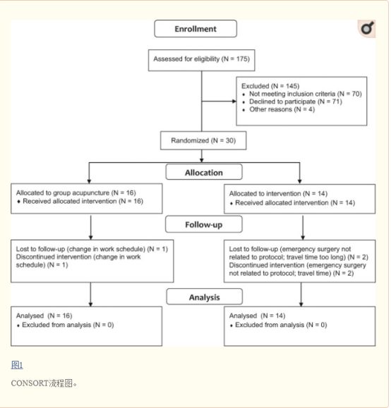 两组均未发生与治疗方案或研究参与相关的意外不良事件。针灸组中的1人报告有瘀伤(<1%的治疗),并且有1例头晕在静坐三分钟后得到缓解。CONSORT 图显示了参与者流程( 图1 )。