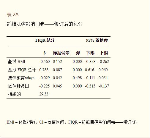 基线数据中,两组患者疼痛、BMI、年龄和针灸预期没有差异。 教育组患者在治疗结束和 4 周的随访中没有改善 ( P = 0.50)。针灸组患者在经过群体针灸治疗后显著改善(P < 0.001) FIQR 总分,在治疗结束时(10 周)的建模平均改善为17.3,在4周的随访中继续改善,平均改善为22.3。这些分别代表整体纤维肌痛影响的34%和43%的改善。所有模型的随机效应的 Breusch-Pagan-LaGrange 乘数均有显著差异(P < 0.001),表明随机效应模型是正确的(表 2A)