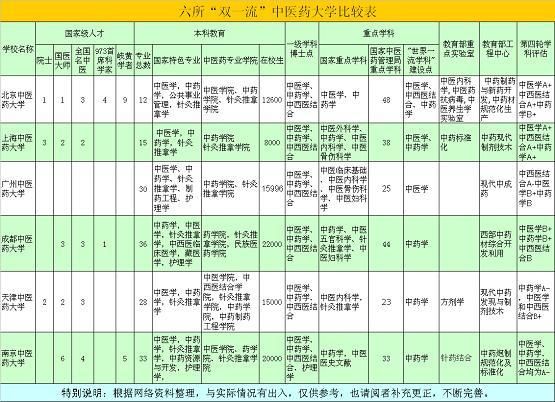 特别说明:为了阅者比较,本号特意制作了中医“新六校”基本情况图。这张图以及本文资料来源于网络(毕竟是人工搜集整理,与实际情况有所出入和有所遗漏在所难免,敬请阅者予以补正完善,请留下你的宝贵意见。