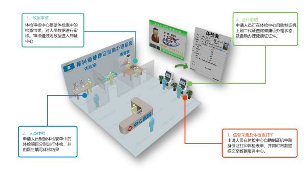 多点自助打印体检表单体检,数据多级审核。制证中心集中自助制证发卡。