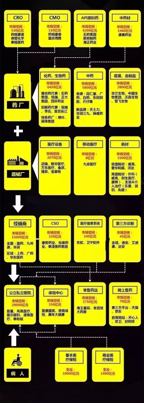 笔者所在团队投资了上图中的药企、器械厂商、流通企业、第三方诊断公司等行业中的多家细分市场前三的企业,并调研过其他各个主要产业链环节的企业。现根据一手调研信息对整个行业的各个环节做简要梳理,主要是自我整理一下大行业的投资逻辑。