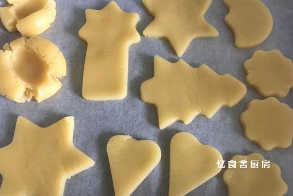 拿出以后分成小面团,然后把小面团擀成3-5毫米厚的面饼,用模具压出一个个形状,最简单的办法切片,或者团成小圆球用大拇指按压一下。