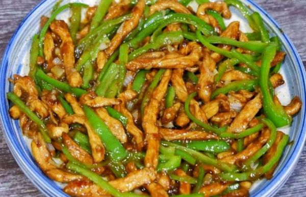 鸡胸肉切成丝,加入1勺料酒,1勺生抽,半勺老抽,1勺淀粉拌匀备用,尖椒切丝,葱切葱花起锅热油,加入鸡肉丝滑炒至变色,鸡丝推到锅边下,加入葱花炒香,加入尖椒,1勺生抽,1勺蚝油,少许盐糖,炒匀出锅即可