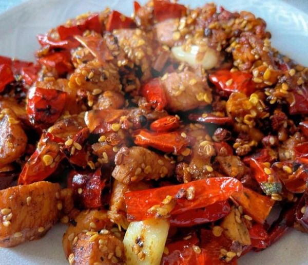 鸡胸肉切成丁,加入姜片+1勺料酒+两勺生抽+1勺蚝油+黑胡椒碎,抓匀腌制至少30分钟干辣椒剪好,准备一小碗干辣椒锅里放少许油,先将鸡胸肉倒进锅里翻炒,多炒一会儿,炒至表面微微焦接着加入蒜、花椒、干辣椒继续翻炒,再加半勺白糖出锅前撒上白芝麻即可