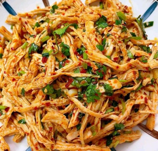 先将鸡胸肉冷水下锅加入姜片料酒焯水,中途撇掉浮末,焯好水捞出用温水洗净2另起一锅温水放入焯好水的鸡胸肉,加入姜片,葱段,料酒,少许盐。水开后煮15分钟煮好的鸡胸肉放入一个大的容器中,晾凉到不烫手后,用手把鸡胸肉撕成鸡丝,稍微细点,因为会更入味。然后切点香菜末,铺在鸡丝上准备凉拌汁,碗中加入蒜末葱花辣椒面芝麻,锅烧热油均匀泼上去,然后加入三勺生抽,一勺半陈醋,少许盐白糖鸡精,搅拌均匀后淋入鸡丝上淋入料汁后,戴一次性手套搅拌均匀,装盘即可开吃