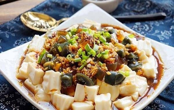主料:皮蛋2个、内脂豆腐150克、香油1毫升、辣椒油5克、蒜3瓣、白糖4克、陈醋4毫升、生抽3毫升、盐少许、葱花少许。