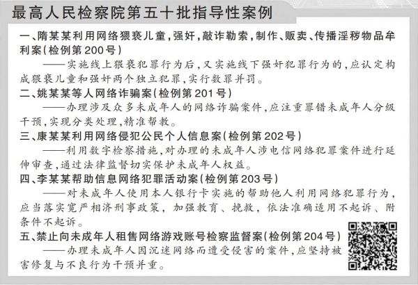 最高检发布的第五十批指导性案例同样体现了检察机关对网络犯罪社会治理的重视。例如,对于康某某利用网络侵犯公民个人信息案(检例第202号),检察机关针对办案中发现在校学生涉嫌电信网络犯罪的实际情况和突出问题,形成了专题报告报送地方党委、政府,并与区工信和科技局、教育体育局等相关部门联动,建立信息交换机制,加强对批量开卡以及短期内反复开卡、注销、补卡等高风险情形的有效管理;推动区工信和科技局出台《电话卡办理程序规范指引》,明确低龄未成年人需在监护人在场并同意的情况下申请入网。在禁止向未成年人租售网络游戏账号检察监督案(检例第204号)中,检察机关进一步会同区网信办等单位制定了涉未成年人网络保护分类处置的标准化工作流程。在此基础上,上海市检察院梳理全市未成年人网络保护案件办理情况,与上海市网信办、上海市文化和旅游局执法总队建立了未成年人网络保护联动工作机制,共同发布《未成年人网络保护风险识别清单》等文件,细化执法规范和标准。从中可以明显看出,检察机关采取了一系列措施来推动涉未成年人网络违法犯罪的源头治理,这些措施是值得充分肯定的。