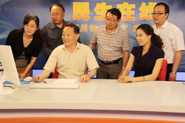 青岛市食品药品监督管理局副局长李方林(一排左一)与网民进行在线交流 (周琦 摄)