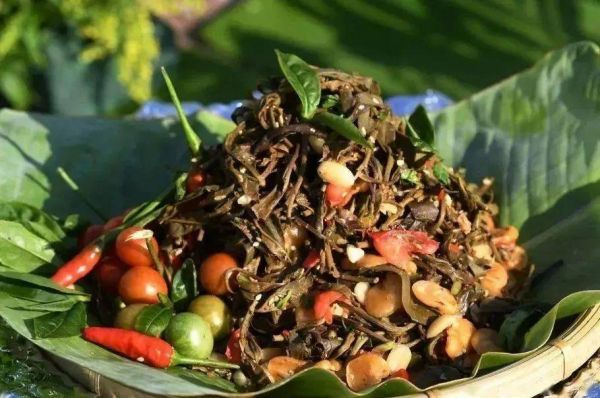 德昂族凉拌酸茶,德宏州的茶文化源远流长,德宏人特别是德昂族善于用茶叶把菜品更深层的味道提炼出来。品德宏凉拌酸茶就是茶叶和菜品完美相融的一道德宏菜。