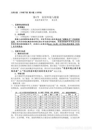 北师大版八年级下册第24章人与环境第4节家居环境与健康一、【课程标准要求】1、重要概念(1)(举例说明)人类活动对生物圈有重要影响。(2)(举例说明)生物与环境相互依赖、相互影响。2、内容标准(1)(举例说明)生物的生存依赖一定的环境。根据上述的课程标准要求可见,对本节内容主要是要达到“理解水平”中的举例说明,此外在传递此概念的时候还要让学生能有所感悟,并愿意根据所学内容去改善家居环境和提高健康水平,在要求上应要达到反应(认同)水平的认同和领悟(内化)水平的养成。二、【教学目标】1、教材内容分析本节课是北师大版八年级下册第24章第3节,主要讲述家居环境直接影响人体健康、改善居室环境有利于人体健康两部分内容。为了达成课标的要求,教材中先设计了一个