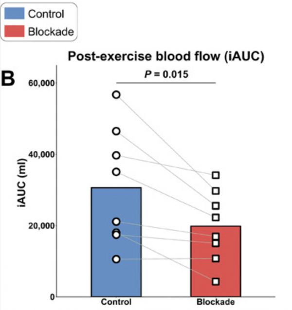 运动后肌肉灌注取决于H1/H2受体信号传导:iAUC(增量曲线下面积)显示,在H1/H2阻断的情况下,运动后的总肌肉灌注量明显减少了约35%。提示组胺H1/H2受体对于调节间歇性运动后肌肉灌注的持续升高至关重要。