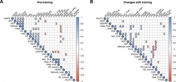 H1/H2受体依赖的间歇训练适应性是高度相互关联的:由于H1/H2受体的慢性阻断削弱了几种不同的训练诱导的适应性,研究探讨了基线时各种功能和机制结果之间的相互关系,以及它们训练诱导的变化。训练诱导的最大运动能力标志物的变化,即VO2max和峰值功率输出,是相互关联的,并与亚最大运动心率的下降有关。最大运动能力的变化与亚最大通气阈值GET和RCP的变化没有关系。另一方面,最大运动能力的增加与血管功能的变化有关。此外,毛细血管-纤维比率的变化与全身胰岛素敏感性的变化之间的相关性进一步支持了微血管在代谢控制中的调节作用。这些相互关系表明通过H1/H2受体的训练引起的变化是相互关联的。