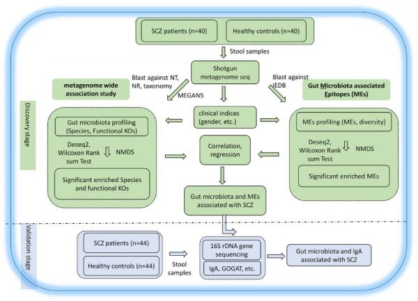 越来越多的证据表明,肠道菌群可能通过免疫和炎症机制参与了精神分裂症的发展。对精神分裂症患者肠道菌群的功能组成,特别是免疫系统的组成进行系统的研究相关的肠道微生物群。抗原蛋白可被机体加工成一系列肽,也被称为免疫表位,是机体识别抗原和诱导适应性免疫反应能力关键组成部分;推测肠道菌群相关表位(MEs)可能介导机体对肠道菌群的免疫应答。