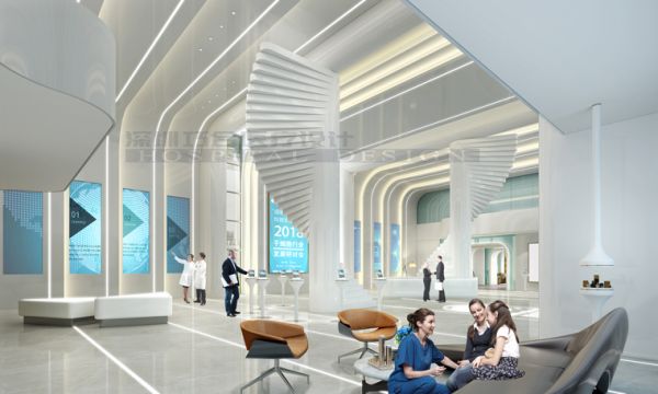 从一楼大厅的设计效果图里就能发现解决方案——大厅圆柱的造型设计,我们一看便知,这是由DNA双螺旋结构中获得灵感,是细胞组织的艺术化表现。从视觉体验来说,这种造型设计在呈现科技感的同时,还为空间增添了想象的意蕴。
