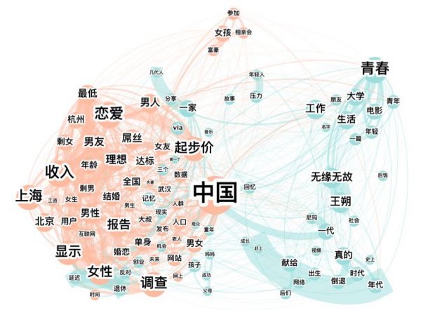 社群3中出现了“工作”、“压力”、“孩子”、“创业”等热词,显示这一部分语义群主要涉及80后对职场和事业的讨论,与社群2结合,表明了80后面对的压力是双重的,对内有养育一家老小的压力,对外有职场和工作压力。