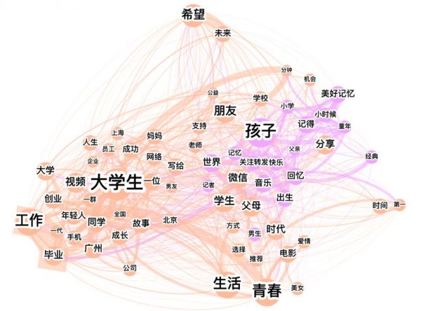 社群2中出现了“大学生”、“工作”、”“机会”、“时代”、“公司”、“创业”、“大学”等热词,显示这一部分语义群主要涉及接受完大学教育,刚刚走入职场的90年代生人,在刚开始奋斗阶段的状态。其中,“梦想”、“青春”、“奋斗”等热词显示,总体基调积极向上。