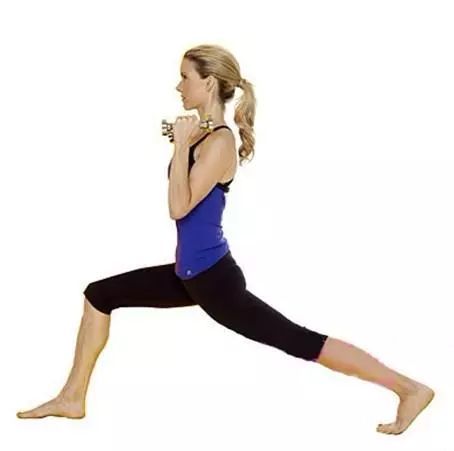方法:迈出左脚,右脚脚尖触地呈脚尖蹲状态,两腿成弓步。将身体重量落到两脚之间,每练习30秒调换一次左右脚。