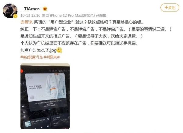 此外还有一位车主在网上吐槽蔚来,称蔚来这样的“用户型企业”就这?“缺这点钱吗?真是够贴心的呢”。不过,随后这位车主又进行了纠正,表示这“不是弹窗广告,是通知栏点开来的推送广告”,并对误导大家表示道歉。但同时又认为车机里面不应该存在广告。