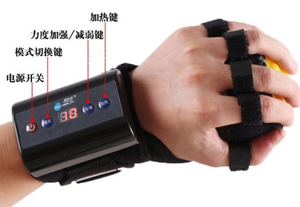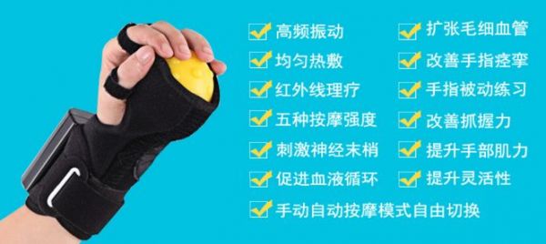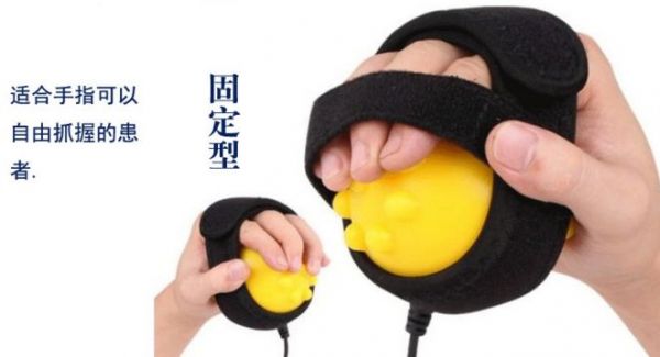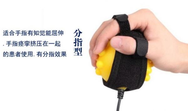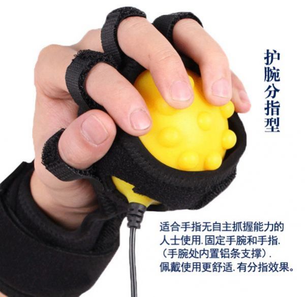 佩戴:如患者手部屈曲,先帮患者打开手指,将球体放入患者手心,让患者手指自然弯曲握住球体,并用固定带固定手部和手指。