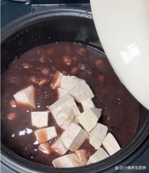 加入芋头:大约煮了半小时左右,红豆和黑米开始变得软糯时,加入芋头块,继续小火慢炖。