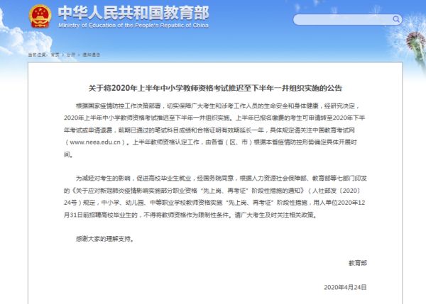 4月24日,育部发布公告称,2020年上半年中小学教师资格考试推迟至下半年一并组织实施。用人单位2020年12月31日前招聘高校毕业生的,不得将教师资格作为限制性条件。