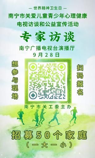 听专家解答家长的疑惑,听孩子们说说自己的心声。9月28日,2024 年“世界精神卫生日”·南宁市关爱儿童青少年心理健康电视访谈和公益宣传活动正式开启。现在我们诚挚邀请50个市民家庭亲临现场,共同关注儿童青少年心理健康。