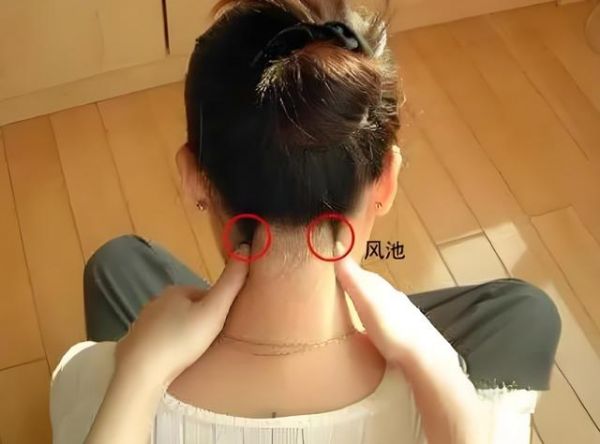 脑后的风池,这是个很重要的穴位,它是头部和脊柱的结合部,我们用大拇指这样往上顶,大家可以用力按揉2分钟,放松颈椎,改善循循环环,会感觉头部脖子肩没那么沉重了。