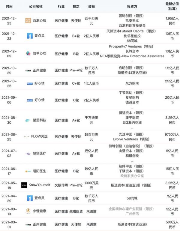 数字化诊疗平台和基于人工智能支持的数字疗法(Digital therapeutics)是国内心理健康领域目前的投资热点。2021年,在IT桔子归类为心理健康领域的合计14起投资事件中,「壹点灵」、「简单心理」、「好心情」、「昭阳医生」4家公司为互联网+/数字诊疗平台,且均获得了上亿元的投资;「西湖心辰」、「正岸健康」、「望里科技」、「小懂健康」4家公司涉及AI技术或数字疗法;此外还包括脑科学医疗器械公司「慧创医疗」、冥想APP「FLOW冥想」和泛心理学平台「KnowYourself」。