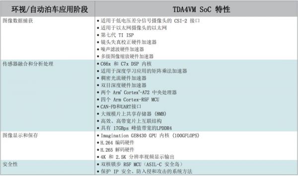 显示视频和其他传感器输入、显示输出和对压缩视频文件存储器的访问。上表介绍环视和自动泊车应用的处理阶段,以及支持这些处理阶段的 TDA4VM 器件的主要特性。TDA4VM 器件是非常完整的片上系统,适用于这类泊车应用。