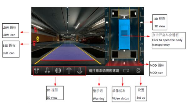本产品为360°环视AI预警系统,可提供全天候无盲区的车周实时画面显示,结合最新物体识别算法,为用户提供更安全的行车环境。产品通过四路高清摄像头实时捕捉车周影像,对影像进行畸变矫正处理及画面无缝拼接,形成一副完整的车辆周边环境鸟瞰图,并结合最新的3D 图像引擎,减少用户视角盲区。同时智能的ADAS 物体识别算法,实时处理车道线及车周物体,为用户提前判别周围危险区域,减少刮伤、碰撞等交通事故,提高行驶安全。