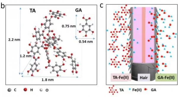 由此可见,这一染发过程效率更高,颜色稳定,且使用的没食子酸和二价铁离子均对人体无害;染发过程以水为介质,不需要像现在的染发那样添加破坏头发毛鳞片的物质,从而能更好地保护发质。
