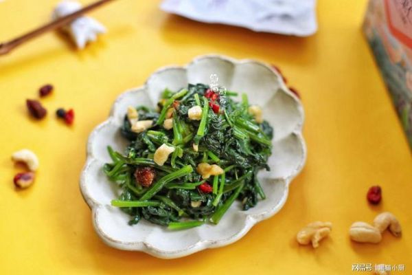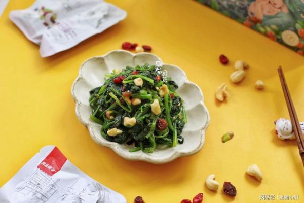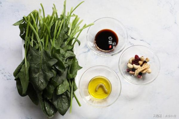 食材:菠菜1斤,芥末酱2克,黑米醋10克,橄榄油5克,盐少许,坚果干果一袋。