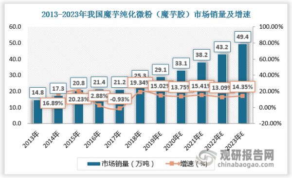 根据数据,2013-2018年我国魔芋纯化微粉(魔芋胶)市场销量由14800吨增长至25300吨,年复合增长率为 11.3%;推算2023年我国魔芋纯化微粉(魔芋胶)市场销量约为49400吨。