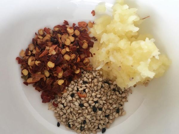 调味: 蒜末、辣椒、白芝麻(一会里面乱跑入的那几棵黑芝麻被我拿走了)