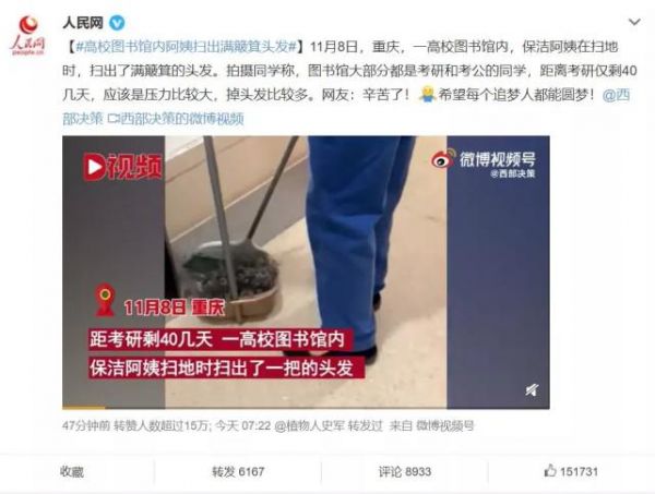 近日,重庆#高校图书馆内阿姨扫出满簸箕头发#,可能是因为图书馆中都是考研的同学,压力大所以头发掉得多。