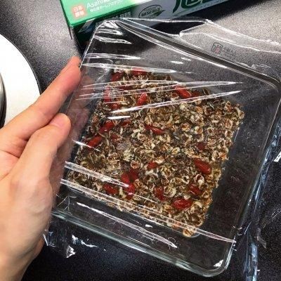 5、盖上保鲜膜,用能耐高温的保鲜膜哈。