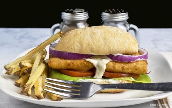 取一片面包,依次铺上生菜叶、番茄片、火腿片、荷包蛋,挤上沙拉酱和番茄酱,再盖上另一片面包。