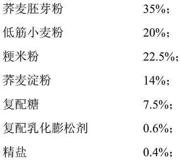 (1)将350g荞麦胚芽粉、200g低筋小麦粉、225g粳米粉、140g荞麦淀粉、75g复配糖、6g复配乳化膨松剂、4g精盐混合搅拌均匀,得到含有荞麦胚芽粉的低糖荞麦煎饼预混粉;