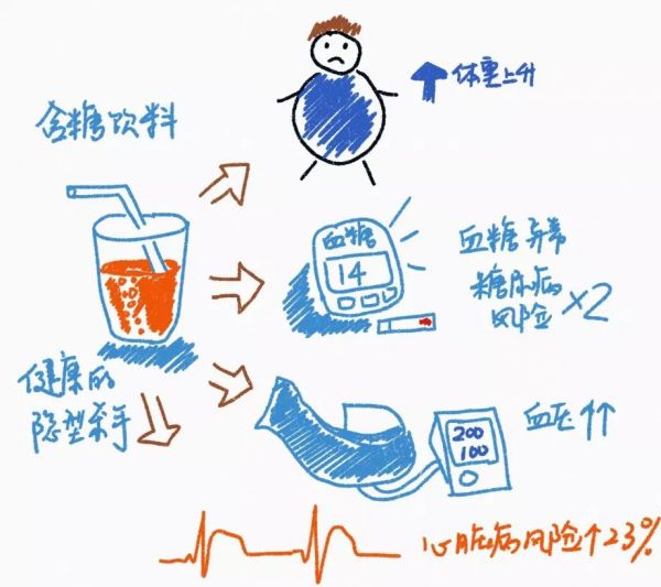 喝含糖饮料多的人会不知不觉地喝进很多糖,所以更容易出现肥胖以及肥胖相关的代谢综合征、糖尿病等问题。