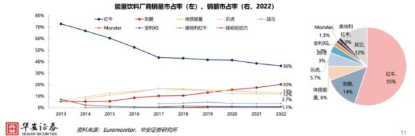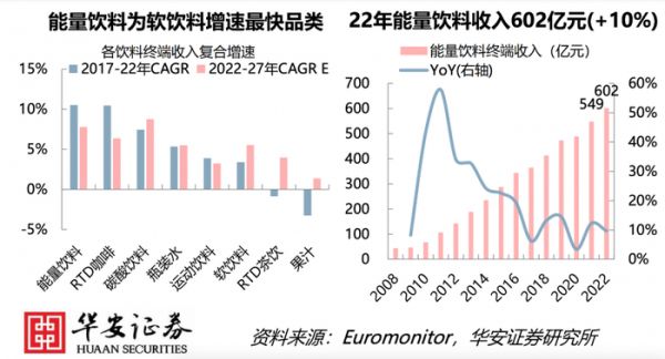 华安证券分析师在此前的一份报告中引述第三方数据表示,2022年,中国能量饮料终端收入为602亿元,2017~2022年年均复合增长率为11%,是各软饮料增速最快品类,2022~2027年增长预计仍将高于软饮行业整体水平,增长动力主要靠渗透率提升。