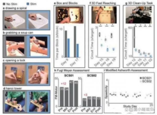 实验发现,在刺激过程中,1号患者能够执行比平时更平稳、更快、更准确的动作,并达到在没有刺激的情况下无法达到的目标。损伤更为严重的2号患者在辅助刺激下也能够成功完成任务,如肩部不代偿情况下的伸肘、触摸等运动。例如抓钥匙、开锁、自主进食等。2号患者测试了动力外骨骼(Hocoma Armeo Power)中的表现,通过刺激,SCS02的任务效率显著提高,任务成功率大大上升。比如,从木销钉上取下一个空心圆柱体,然后将其滑到另一个木销钉上。借助SCS,该患者不仅能够抓住并举起金属圆柱体,还能将其放置在相邻的销钉上,此过程无需任何重量支撑辅助。