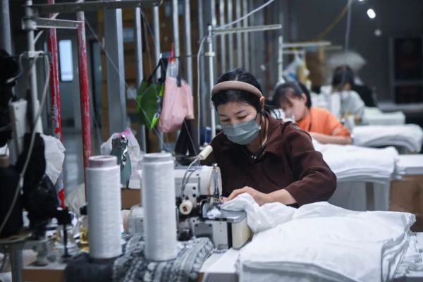 浙江诸暨市一家企业的车间内,工作人员正在加工拉绒打底裤。徐昱摄(新华社)