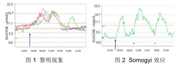 持续葡萄糖监测(CGM)图谱可反映患者全天的血糖波动,帮助临床医师发现苏木杰效应、餐后高血糖、夜间低血糖、黎明现象等传统血糖监测方法不易发现的情况。