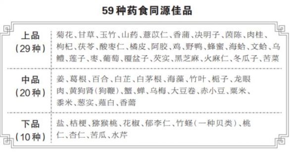 中医食疗学源远流长,距今至少有3000多年历史。原始社会的人类在寻找食物的过程中,发现了有治疗作用的食物,可作为食,也可作为药。寻找食物的体验带动医药的发展,因而我国自古就有“医食同源”“药食同宗”的说法。我国营养学专家燕宪涛等对《神农本草经》所载365种药物整理归纳,发现属于食物范畴的达59种之多(见图表)。我国现存最早的医学巨著《黄帝内经》也十分注意饮食调养,指出:“饮食自倍,肠胃乃伤。”强调治病要“以食为养”,不能“惟药是治”。