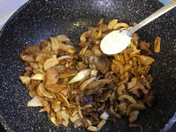 4、再次热锅烧油,等到油热后,放入猪肉丁,进行煸炒,再加入煎炸好的冬笋,翻炒均匀;