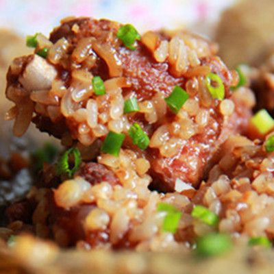 原料:猪肋排1000克、荷叶、姜、蒜、糯米、老抽、生抽、白砂糖、二锅头