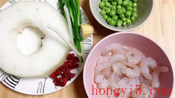 第一步准备食材。适量的虾仁,冬瓜,干辣椒,生姜,葱花以及盐,蚝油,生抽,老抽,胡椒粉,淀粉,料酒,以及适量的清水等等。