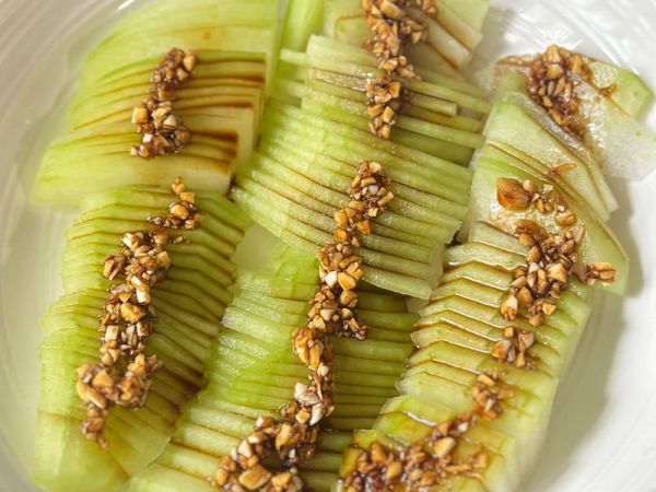 2、冬瓜去皮洗净切薄片摆盘如上图
